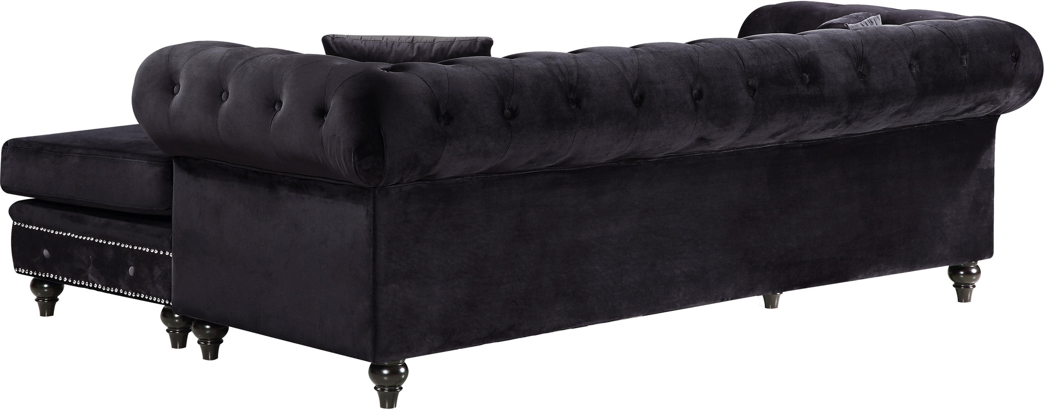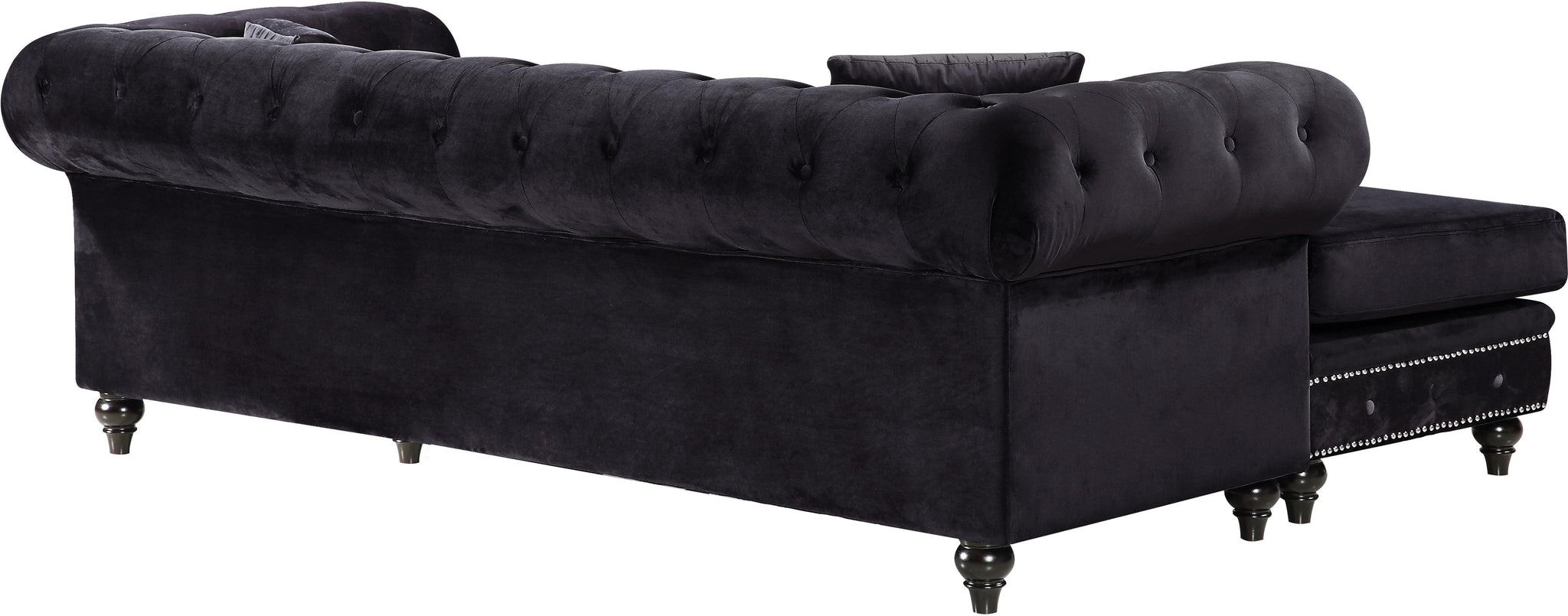 Lounge in luxurious style and comfort with this sleek Sabrina black velvet reversible two-piece sectional. Featuring elegant, plush velvet upholstery and a deep tufted back, this sectional is a little piece of heaven for you to kick back and relax on. Double row chrome nailheads give the sectional a contemporary element, and a reversible chaise offers a comfortable place to kick up your feet after a long day. Pillows are included as well to add to your comfort.