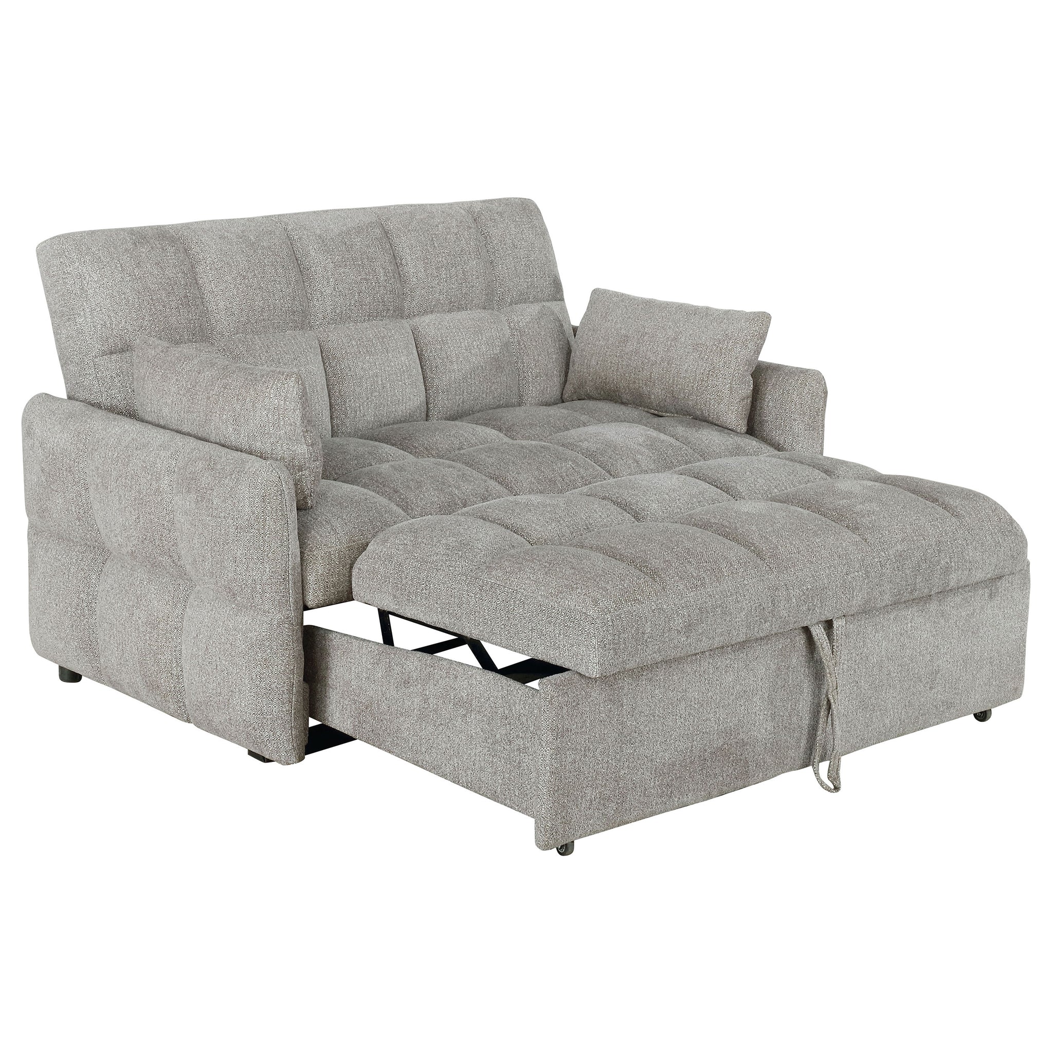 Bring versatility and comfort into your living space with this convertible sleeper sofa. Upholstered in soft chenille with all-over tufting, it combines cozy seating with a modern profile. Slim track arms and a rectangular backrest lend clean lines and contemporary appeal. The back folds flat for an easy transition into sleeping space, while a pull-out mechanism extends the lounge into a bed for guests. Crafted with a kiln-dried hardwood frame, sinuous spring decking, and high-resilience foam, it offers long-lasting comfort and support._x005F_x000D_ Key Features: • Light grey sleeper sofa bed upholstered in soft chenille fabric with tufted design • Back folds flat for an easy conversion from stylish sofa to sleeping surface • Pull-out sleeper mechanism extends the seat into a comfortable guest bed • Kiln-dried hardwood frame ensures strength and long-lasting durability • Sinuous spring decking with high resilience foam provides lasting comfort • Includes one-inch memory foam topper and two coordinating accent pillows