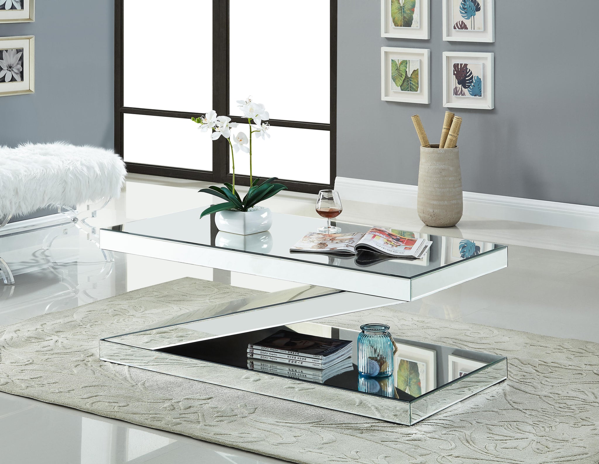 Create an instant focal point in your living room with this Zee coffee table from Meridian Furniture. This handsome table has a unique 'Z' design to catch the eye and garner compliments. The shape gives it a sculptural look, while the mirrored accents add dimension and airiness to your room. Use it on its own or alongside other items in the collection.