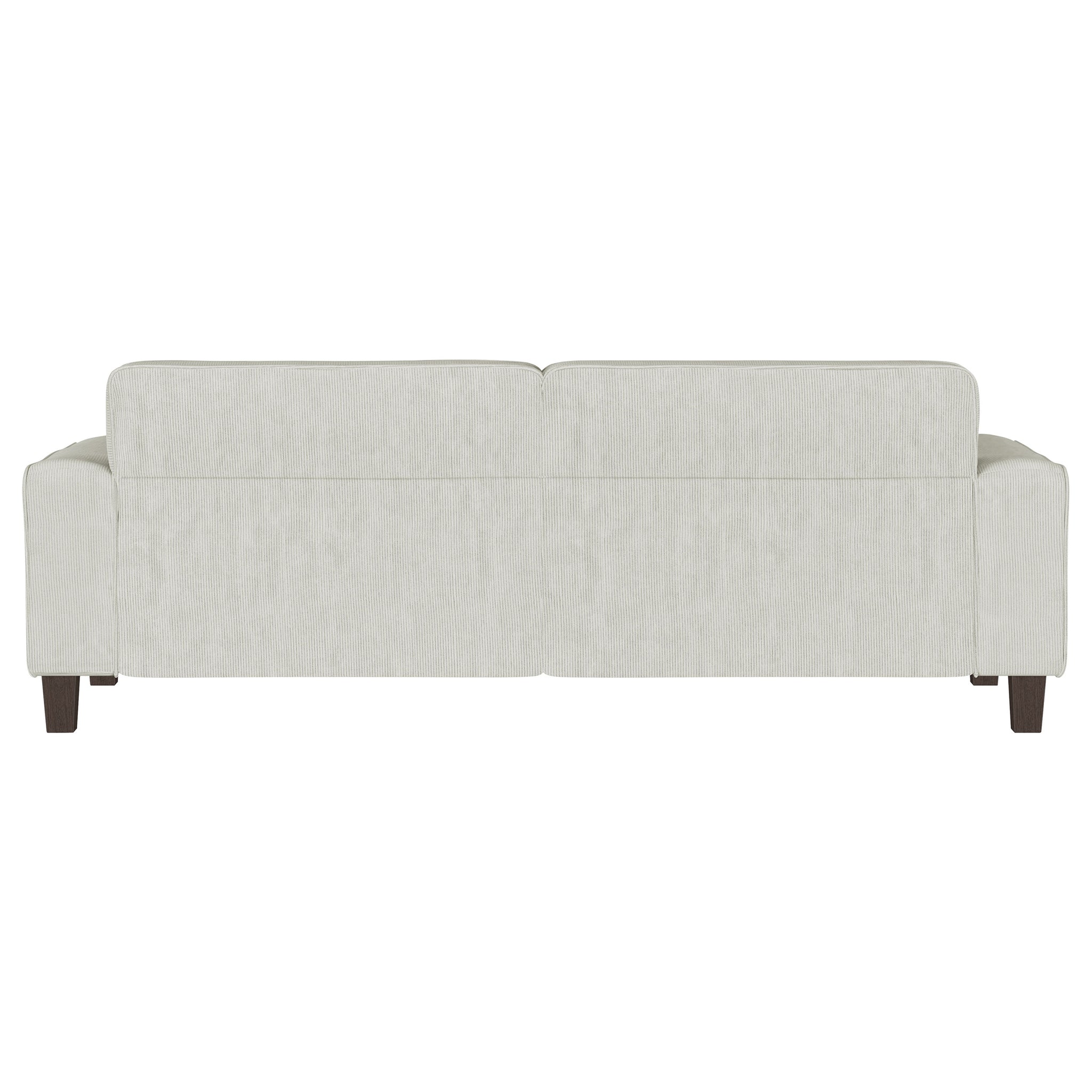 Create a stylish and infinitely comfortable and inviting living space with a modern sofa. Its timeless stance features wide track arms that pair perfectly with plush cushions for an indulgent seating experience. Great for game days, entertaining, or evenings at home, the sofa features plush upholstery with corduroy inspired texture that adds depth and dimension. Back cushions are plush and tufted, offering a grid pattern that's clean and refined. Tapering feet complete the look, offering height that creates an airy finishing touch perfect for modern living. Key Features: • A modern sofa offers inviting flair with soft upholstery in a lovely neutral hue • Textured corduroy-style upholstery is extra plush for a cozy and inviting touch • Biscuit tufted back cushions create a stylish touch of texture and dimensionality • Wide track arms define a clean-lined silhouette that offers versatile style in any living space • Tall, tapering wood legs create light, airy lift, perfect for a modern living space • Seats feature sinuous springs and coils for optimal comfort and support