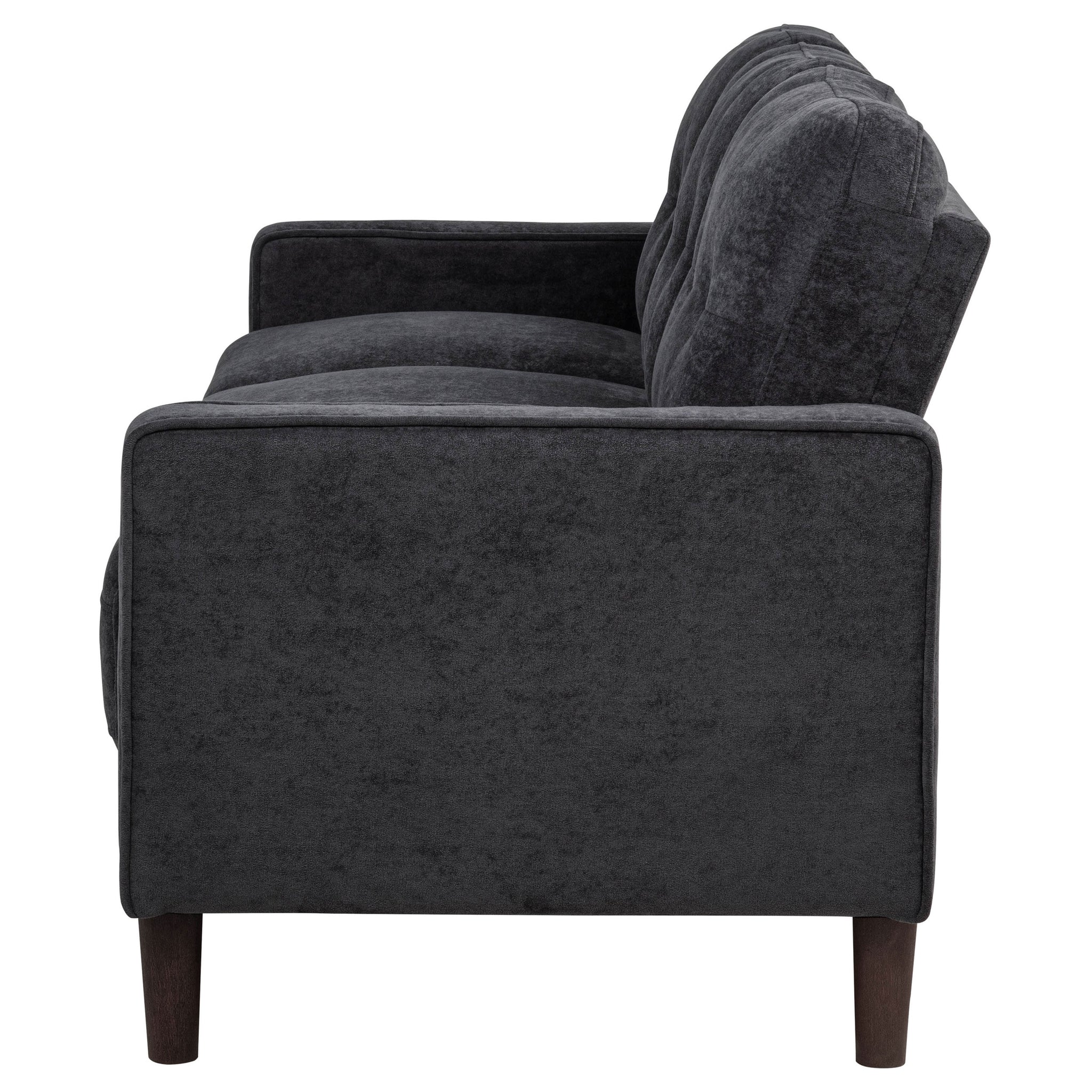 This modern sofa invites relaxation with its crisp profile and playful charm. Slim track arms trimmed in cord welt frame plush, grid-tufted cushions for visual appeal and cozy support. Wrapped in softly textured upholstery, it brings warmth and comfort to smaller living areas. Pocket coil seating ensures supportive structure, while tapered legs create a lifted, stable foundation ideal for everyday lounging. Key Features: • Sofa features slim track arms and grid-tufted cushions for tailored charm and cozy support • Rust finish adds contemporary appeal with a softly textured look and tonal versatility • Cord welt trim outlines each arm and cushion for added structure and subtle definition • Pocket coil seat construction provides lasting comfort with excellent shape retention • Fabric upholstery offers a soft, woven texture that's smooth to the touch and easy to maintain • Sturdy tapered plastic legs give this sofa a stable lift and simple modern foundation