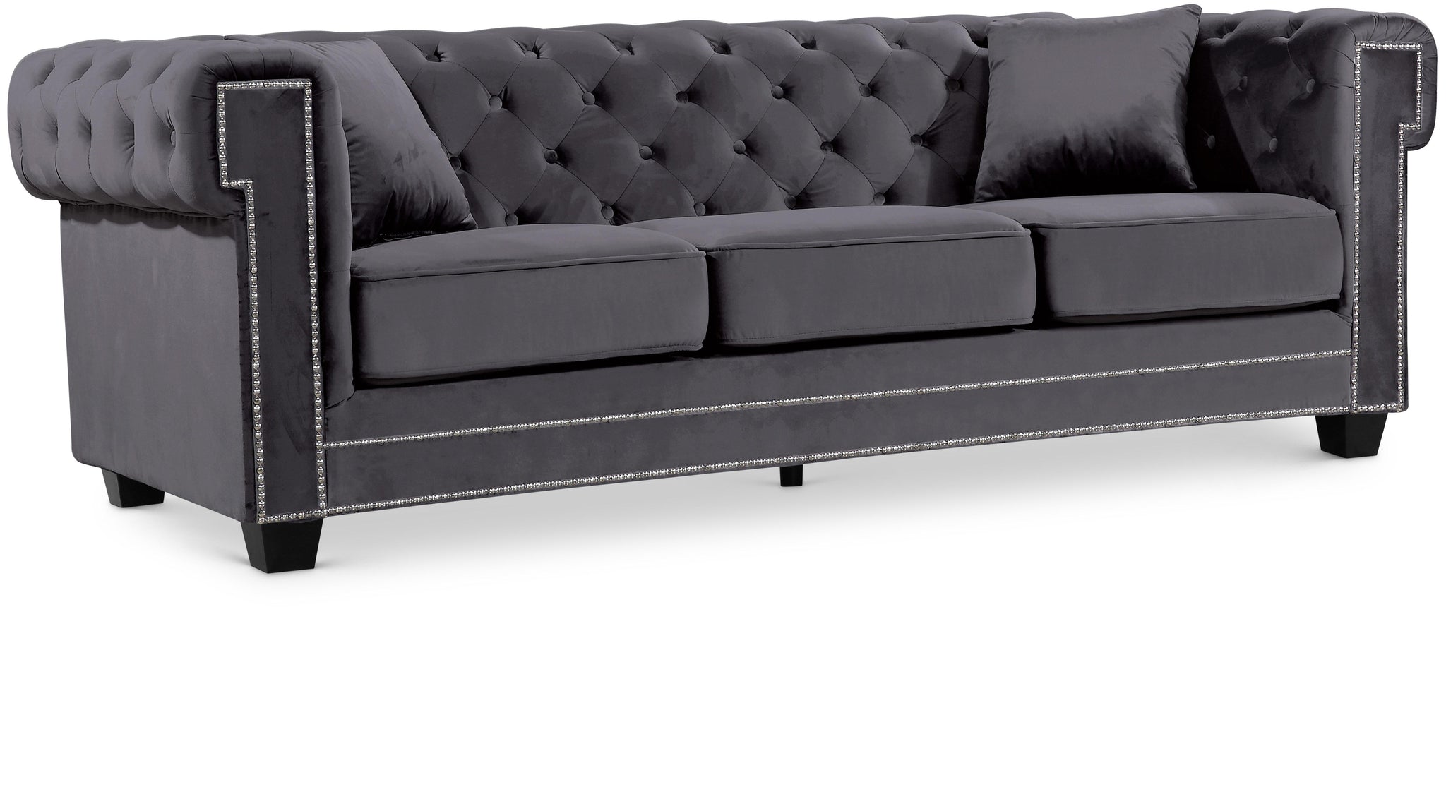 The Bowery Collection by Meridian Furniture. Features beautifully designed tufted velvet upholstery with custom wood legs and a nail head trim. This collection is guaranteed to be the highlight of any home. Throw pillows included.