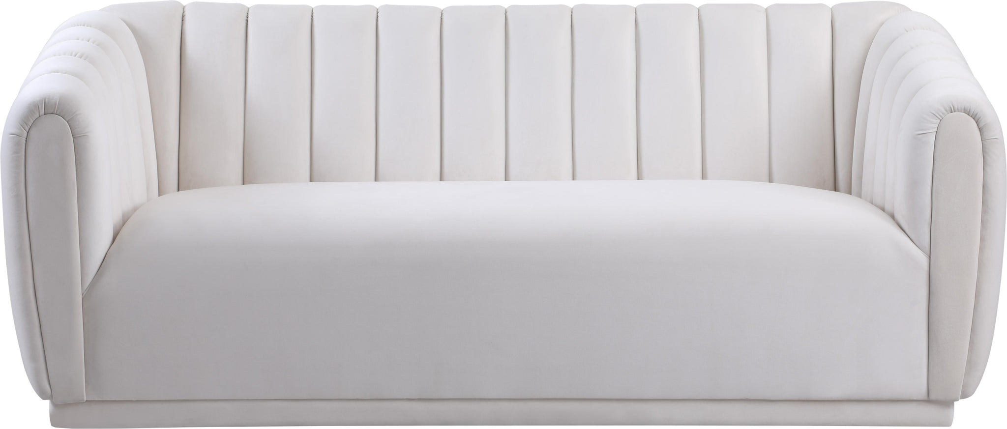 Casual meets elegant in the design of this Dixie velvet sofa. Relax, unwind, and take a load off whileyou'rere kicked back in this handsome seating option. Deep channel tufting adds an upscale touch to the unit���s soft cream velvet upholstery while giving it a dimensional look. Pair this piece with other items in the Dixie collection for a complete and seamless look in the living room or den.