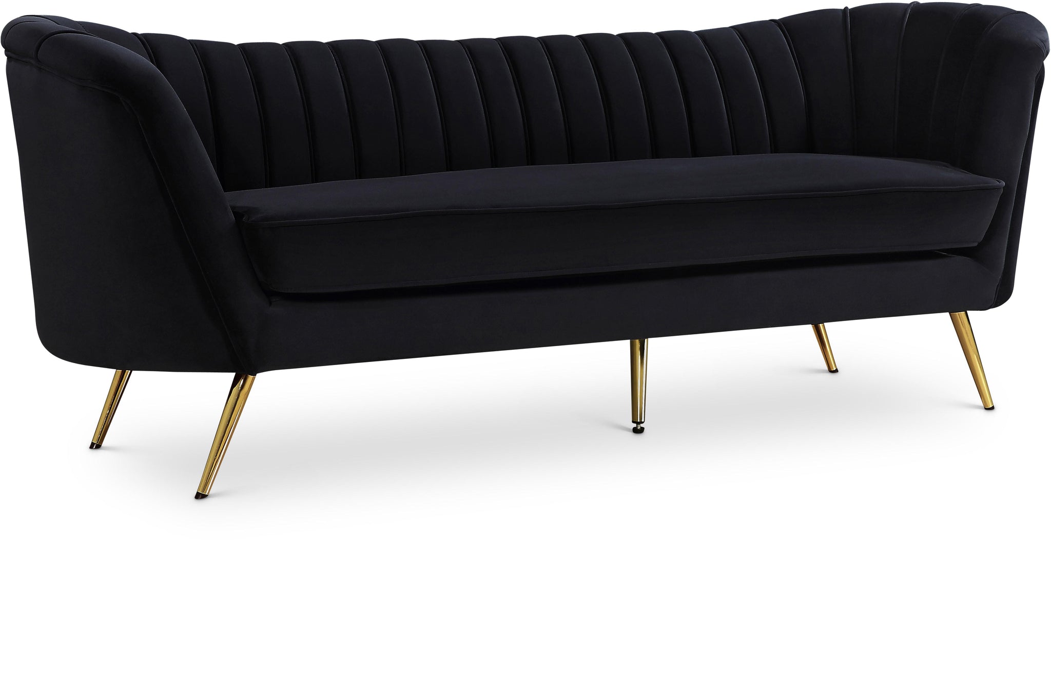 Lean back and lounge in luxurious style on this stunning Margo black velvet sofa by Meridian Furniture. This contemporary sofa features plush velvet upholstery that is both classy and sumptuous against your skin, a single seat cushion and rounded arms that curve into a low, rounded back, creating a perfect, modern piece for your home. Gold stainless steel legs support this sofa and provide stunning contrast to the sofa's plush, black fabric.