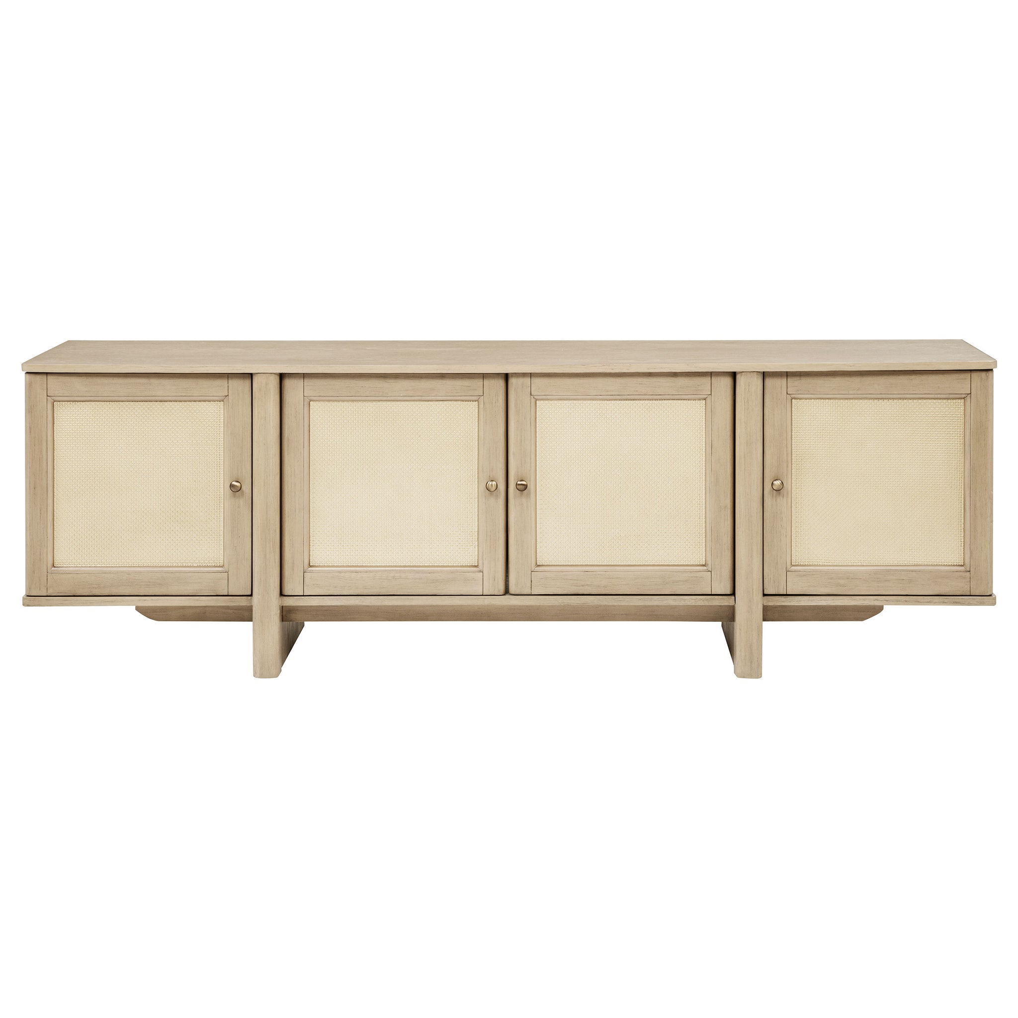 This 79-inch TV stand captures California coastal modern living with a balance of authenticity and ease. Inspired by 1970s silhouettes, its streamlined rectangular case is fitted with four framed doors featuring woven cane fronts, bringing natural texture and depth. Crafted from solid poplar, engineered wood, and oak veneer, it ensures durability with timeless appeal. Designed as a media console or entertainment center, it accommodates up to an 85-inch TV while offering concealed storage for electronics and essentials._x005F_x000D_ Key Features: • TV stand measuring seventy nine inches with framed doors and woven cane panel fronts • Entertainment center accommodates TVs up to 85 inches in size with ease • Solid poplar, engineered wood, and oak veneer construction ensures lasting strength • Four doors conceal ample storage space for electronics, games, or living essentials • Streamlined rectangular profile reflects seventies inspired coastal modern design • Media console combines natural textures with durable build for long term function