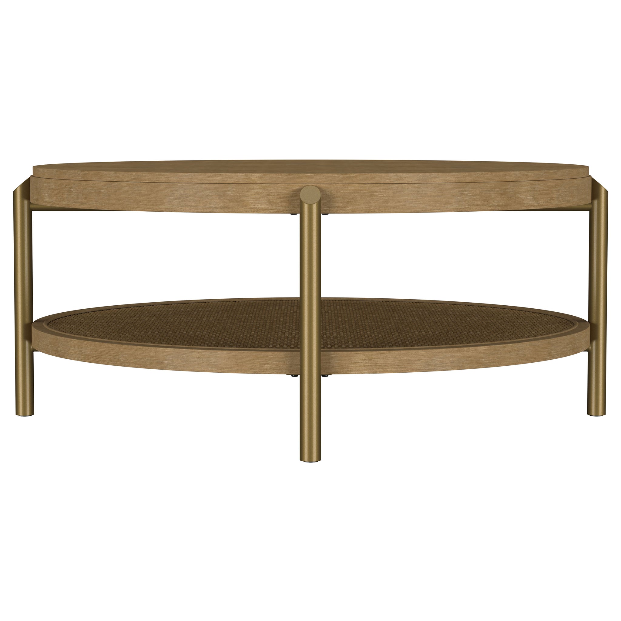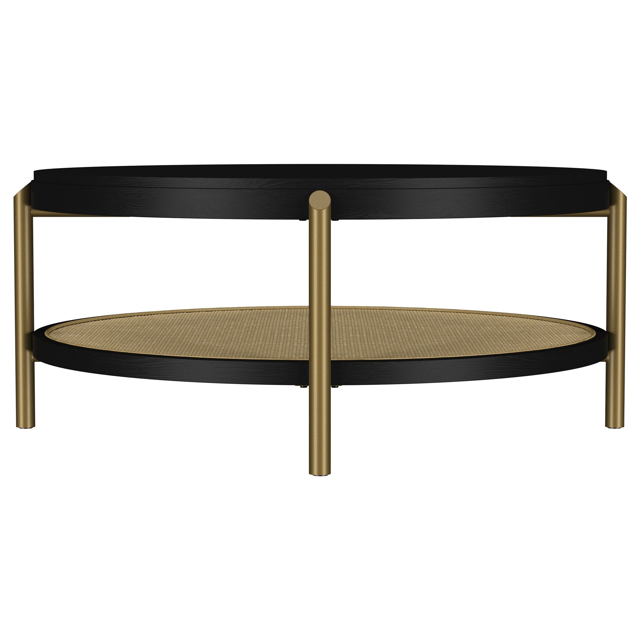 This round coffee table combines modern design with rustic charm, perfect for today’s living spaces. Crafted with Asian hardwood, engineered wood, and ash veneer, its smooth finish highlights the natural wood grain for an organic appeal. The lower shelf features woven rattan, offering practical storage and a textured look. Supported by aged brass-finished metal legs, this cocktail table delivers a balance of durability and style, serving as a functional centerpiece for any living room or lounge area.