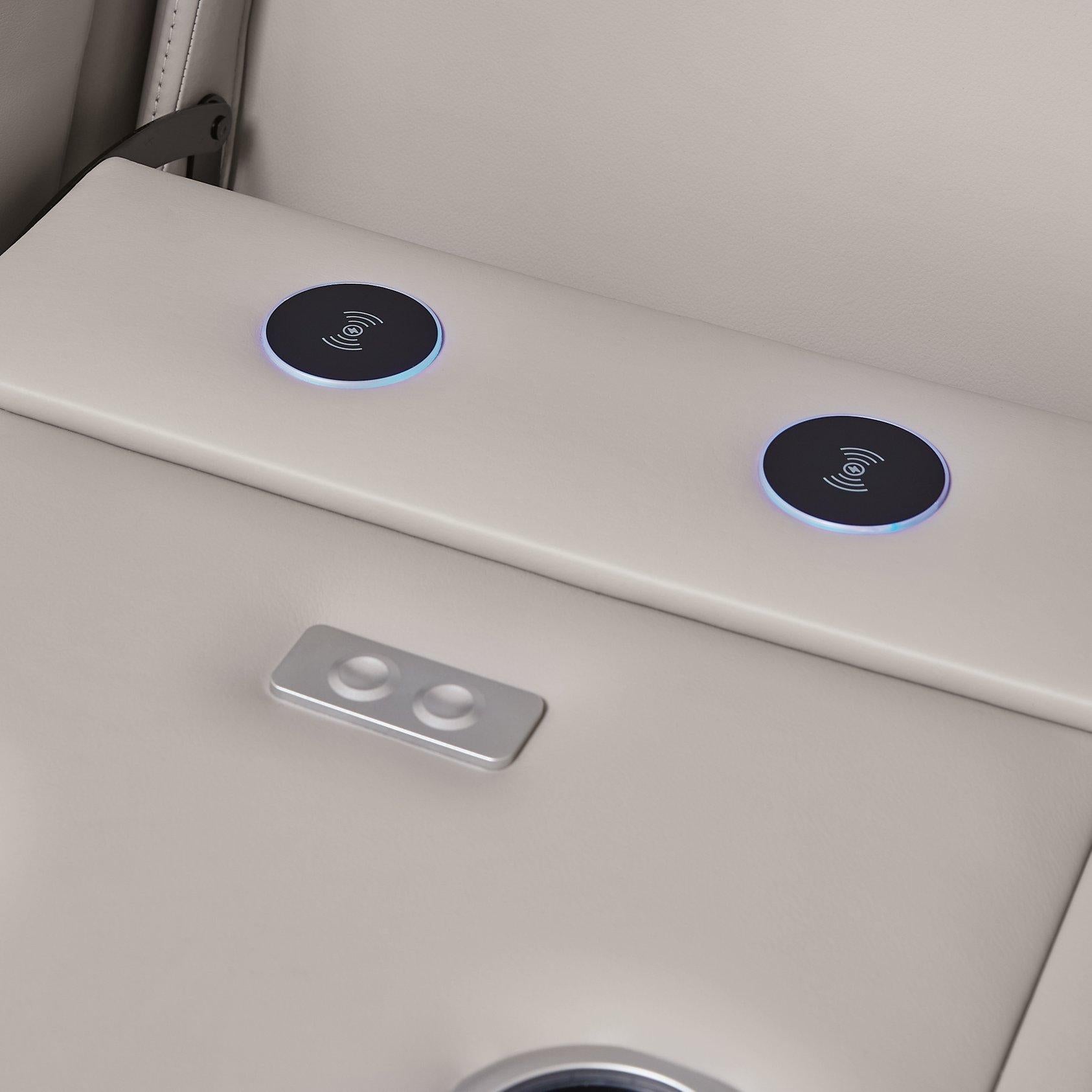• Drop-down table with LED reading lights, dual cup holders and wireless charging; power cord included; UL Listed