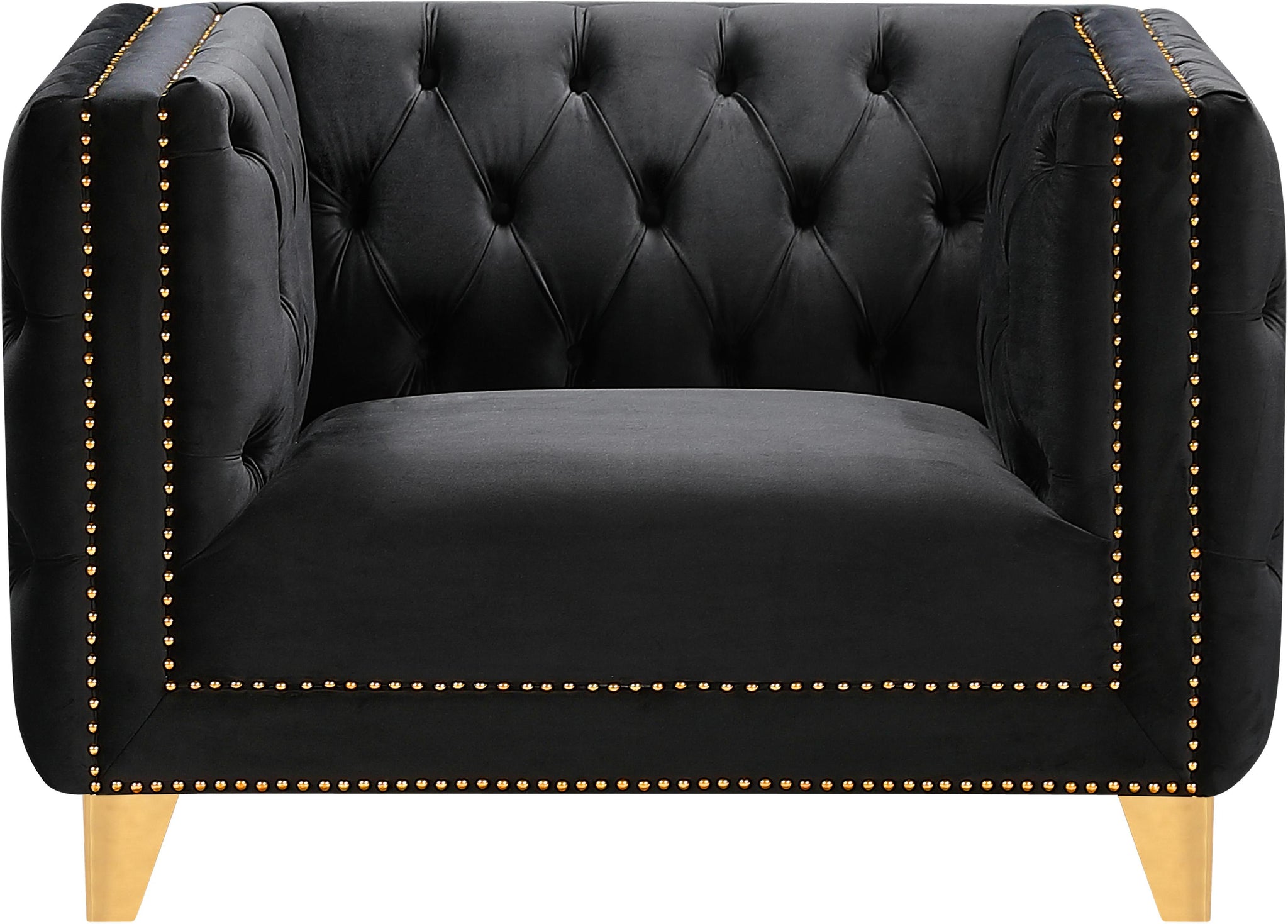 Upholstered in soft black velvet, this Michelle chair is sumptuously glamorous. Designed for upscale living, this chair features rich gold nail head trim and gold iron legs that keep it grounded in contemporary beauty. Tufted material covers every inch of this unit, and button tufting ensures that the unit stays plump and comfortable and holds up well to continual use. Pair it with other items in the collection for a cohesive look.
