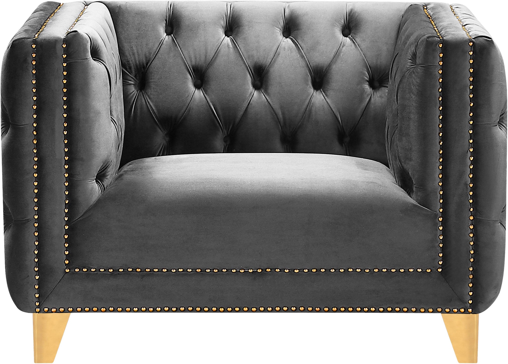 Upholstered in soft grey velvet, this Michelle chair is sumptuously glamorous. Designed for upscale living, this chair features rich gold nail head trim and gold iron legs that keep it grounded in contemporary beauty. Tufted material covers every inch of this unit, and button tufting ensures that the unit stays plump and comfortable and holds up well to continual use. Pair it with other items in the collection for a cohesive look.